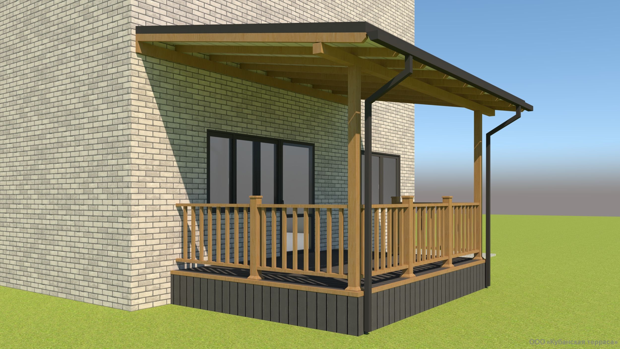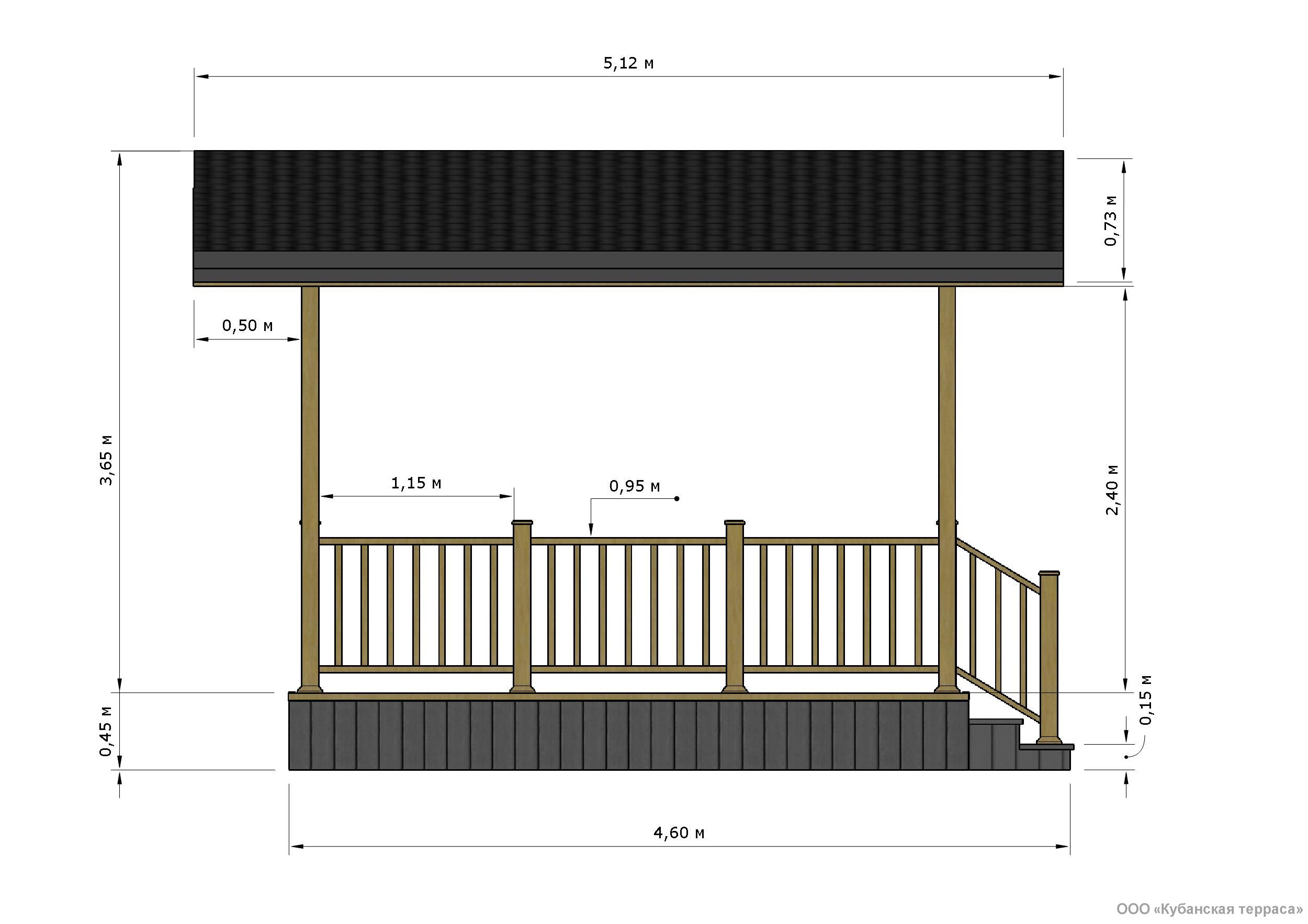 Основание - свайное поле. Каркас террасы и ступеней выполнен из стальной профильной трубы, окрашенной краской-грунт. Настил и торец из террасной доски ДПК, ступени из ДПК. Ограждения из ДПК. Крыша выполнена с открытой страпильной системой, потолок - имитация бруса, окрашенная маслом/пропиткой в два слоя.